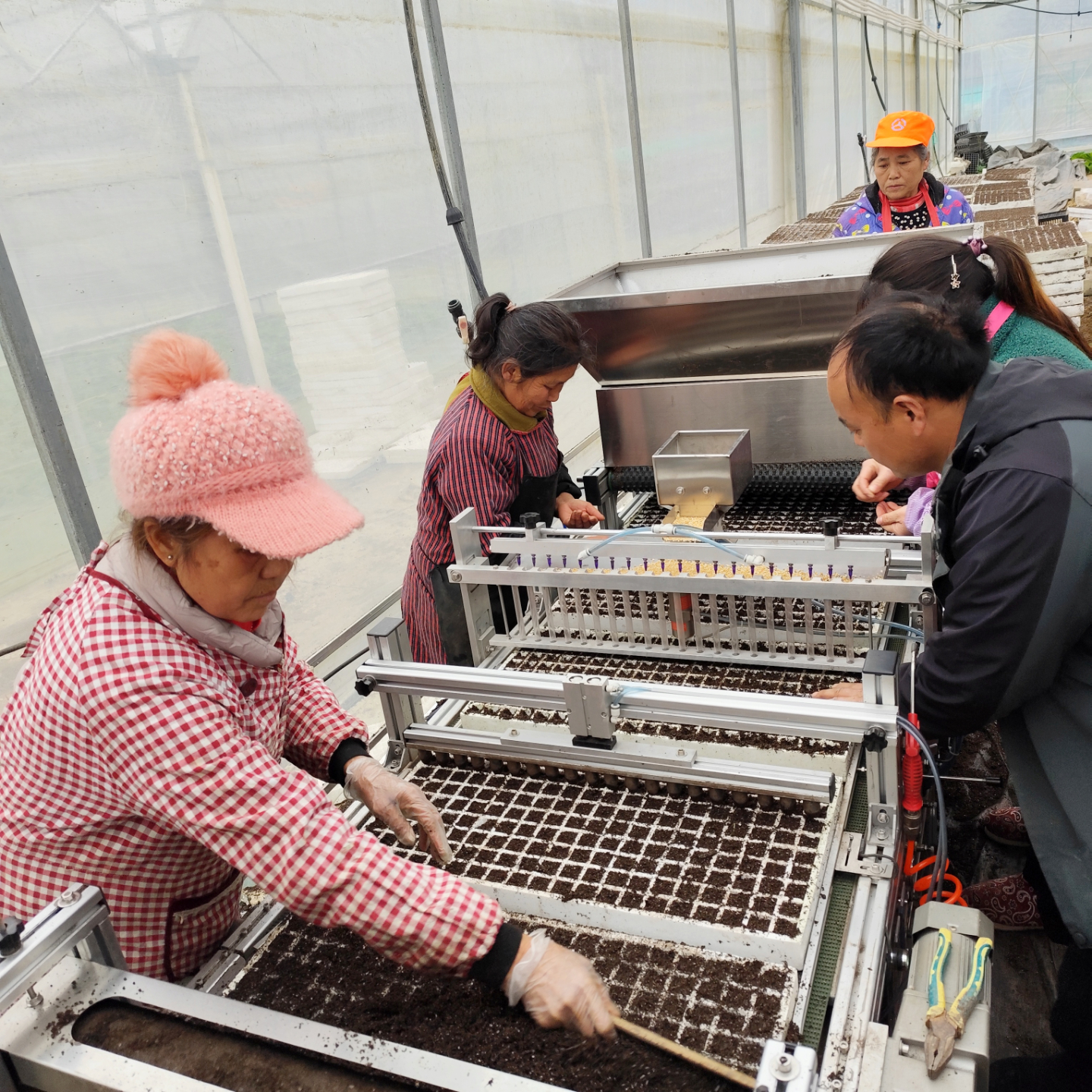 育苗现场,工人将装好基质肥料的穴盘摆放到辣椒自动化播种机平台上,只需几秒钟,穴盘上就撒播好辣椒种,工人再将一盘盘辣椒穴盘整齐地摆放在水槽上。