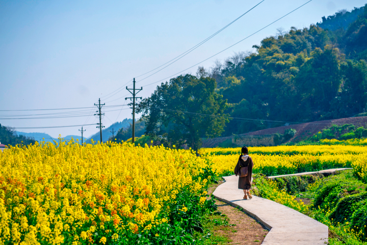 油菜花开春意浓,踏春赏花正当时。眼下,大渡口区金鳌田园综合体、中梁山康养项目约1500亩油菜花竞相绽放,把乡村田野装扮得一片金黄。田野上、花海间,伴着花香,游人纷至沓来,感受春天的气息。图为新合村油菜花海。