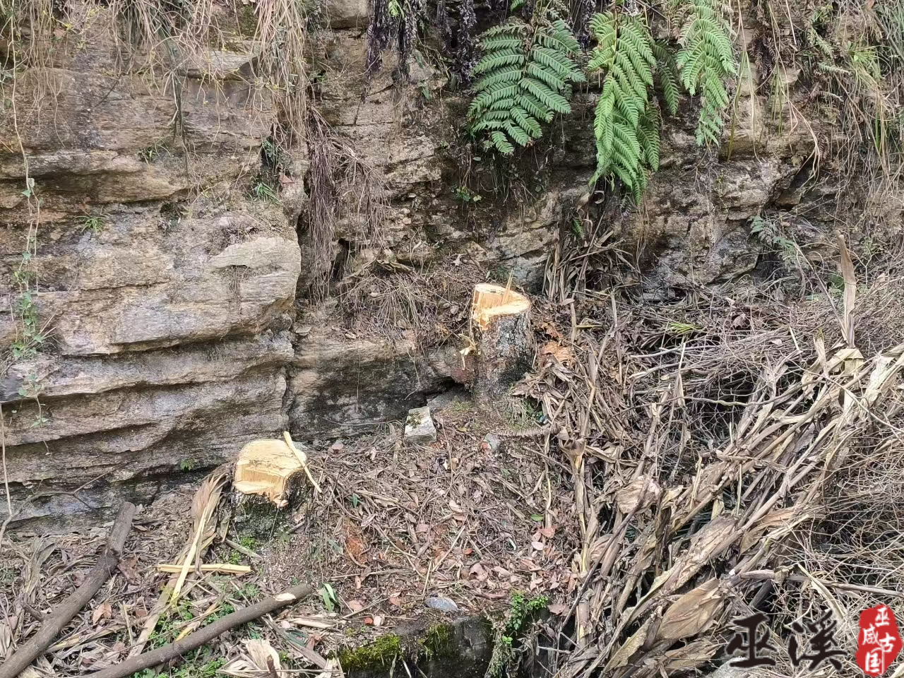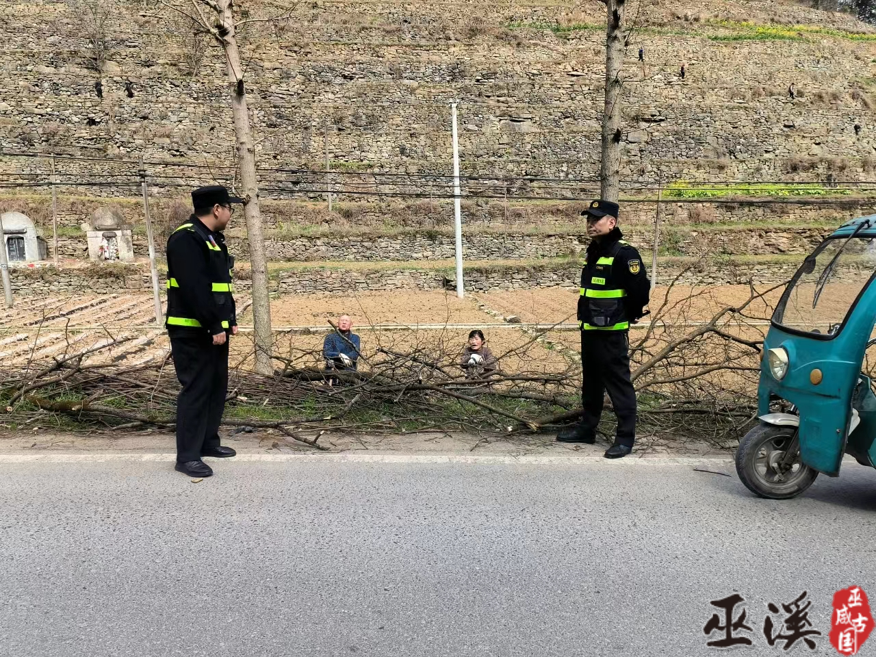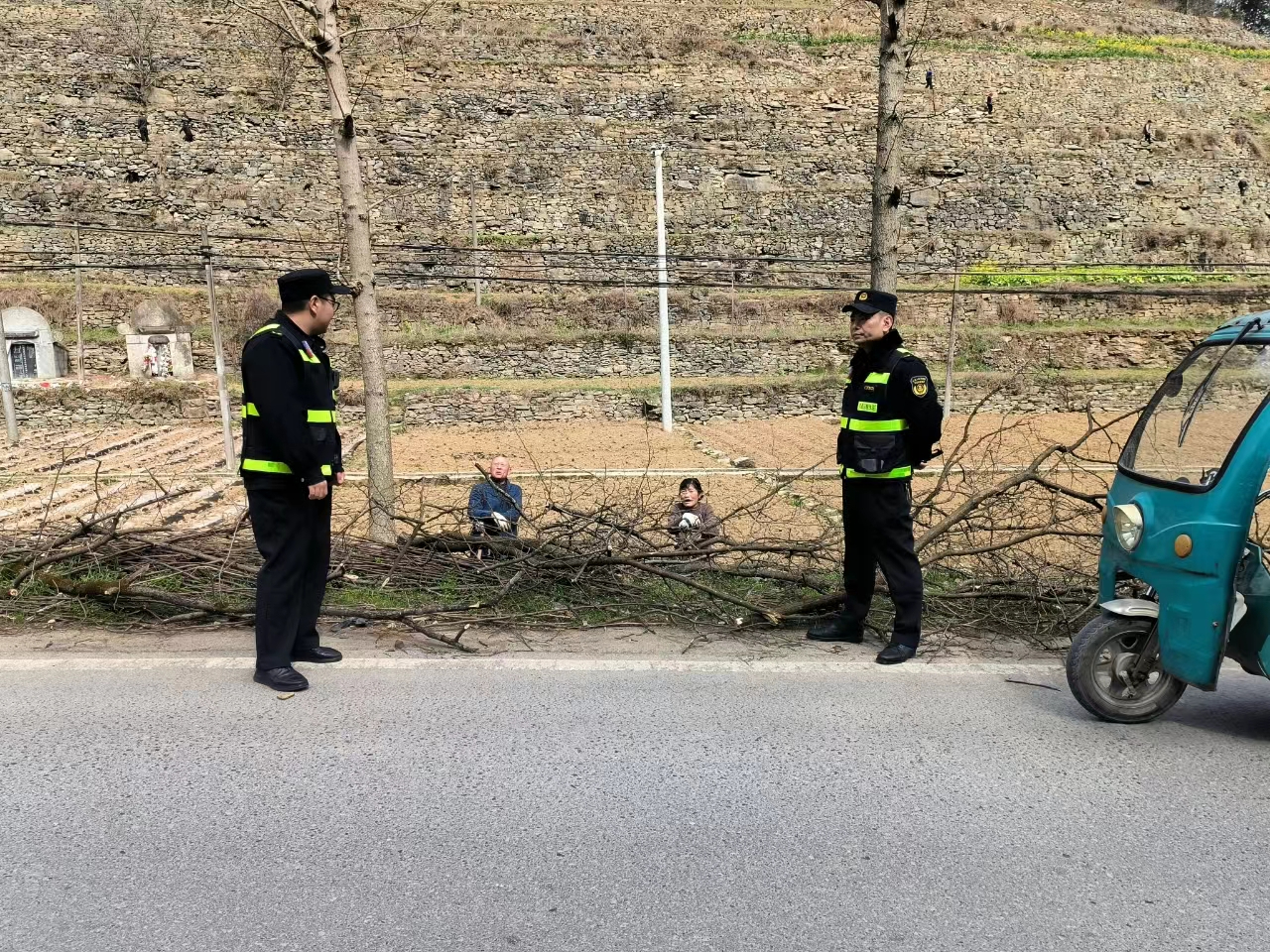 执法人员当即对周边农户进行走访了解情况,询问村民后得知该乡镇正在进行森林防火带砍伐工作,路边堆放的树干树枝正是已经砍伐的防火带,暂时堆放在公路两侧,乡镇工作人员对路面残渣进行过清理,堆放的树干树枝也会在短期内进行处理不会影响道路的安全通行。而被砍伐的行道树是被附近居住的老人砍伐,执法人员找到该老人进行询问得知,两棵行道树在老人家的土地范围内,并且近期行道树被山上掉落的落石砸弯,树干弯曲可能影响道路安全,老人看最近乡镇在进行森林防火带砍伐,自己便将两棵树干弯曲的行道树砍伐。