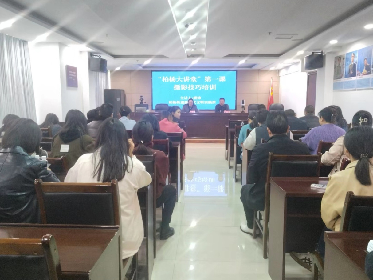 3月22日,柏杨街道新时代文明实践所组织开展 “柏杨大讲堂”培训活动,柏杨街道相关负责人以《摄影技巧培训》为题面向全体干部职工进行专题培训。该街道班子成员、机关、社区干部共计50人参加。