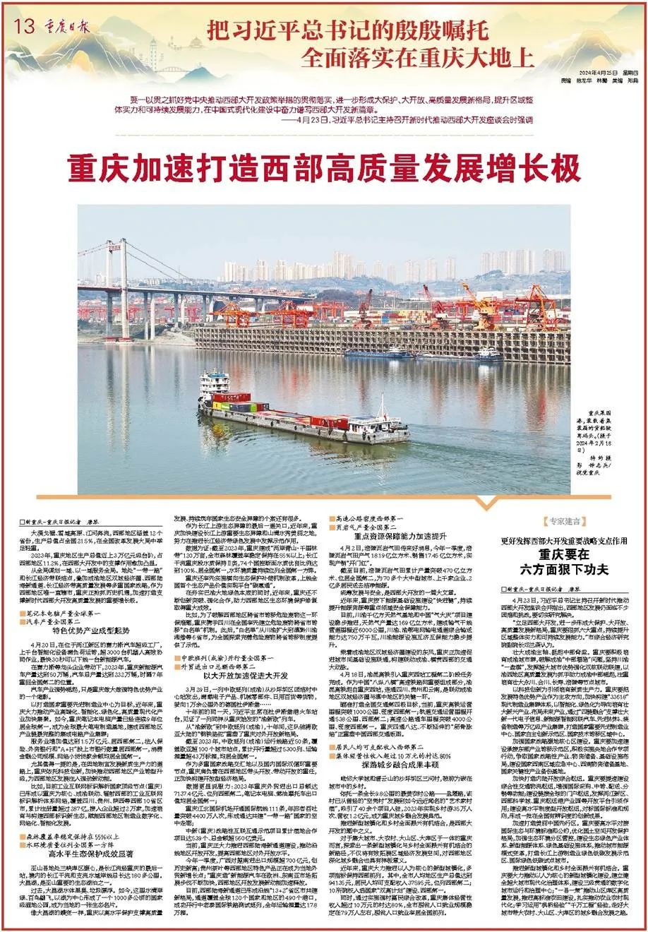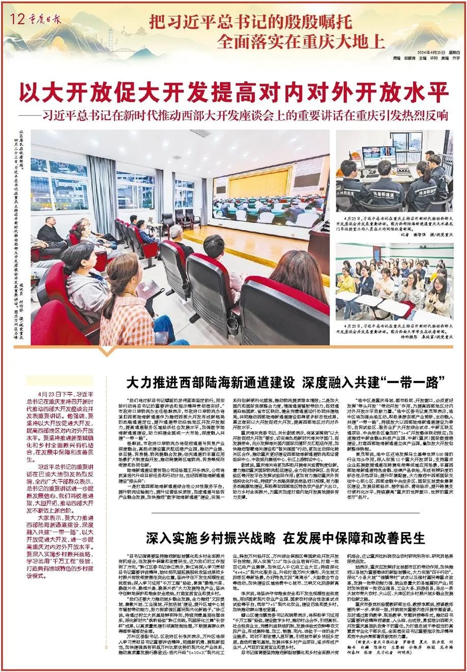4月23日下午,习近平总书记在重庆主持召开新时代推动西部大开发座谈会并发表重要讲话。他强调,要进一步形成大保护、大开放、高质量发展新格局,提升区域整体实力和可持续发展能力,在中国式现代化建设中奋力谱写西部大开发新篇章。