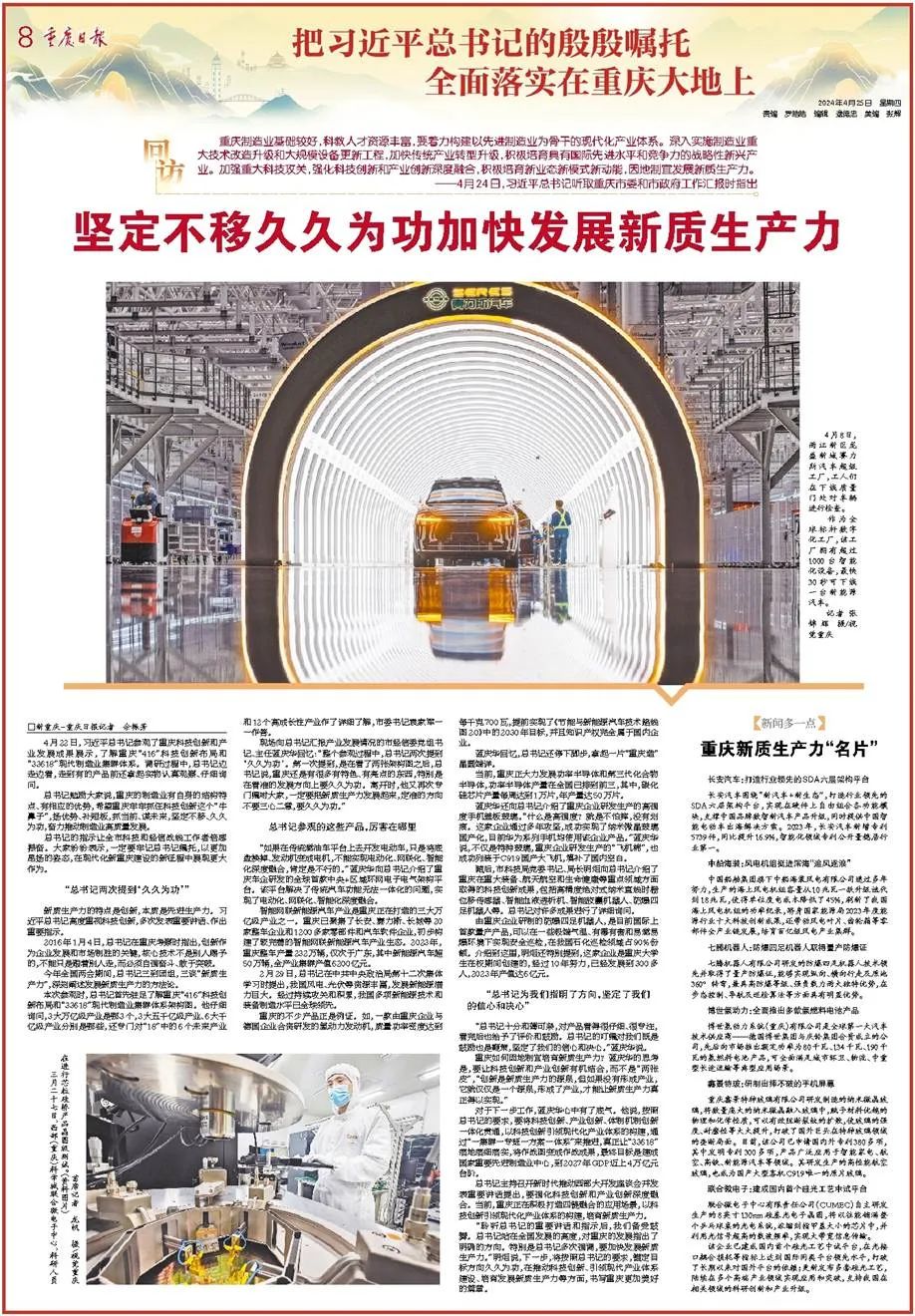 重庆制造业基础较好,科教人才资源丰富,要着力构建以先进制造业为骨干的现代化产业体系。深入实施制造业重大技术改造升级和大规模设备更新工程,加快传统产业转型升级,积极培育具有国际先进水平和竞争力的战略性新兴产业。加强重大科技攻关,强化科技创新和产业创新深度融合,积极培育新业态新模式新动能,因地制宜发展新质生产力。