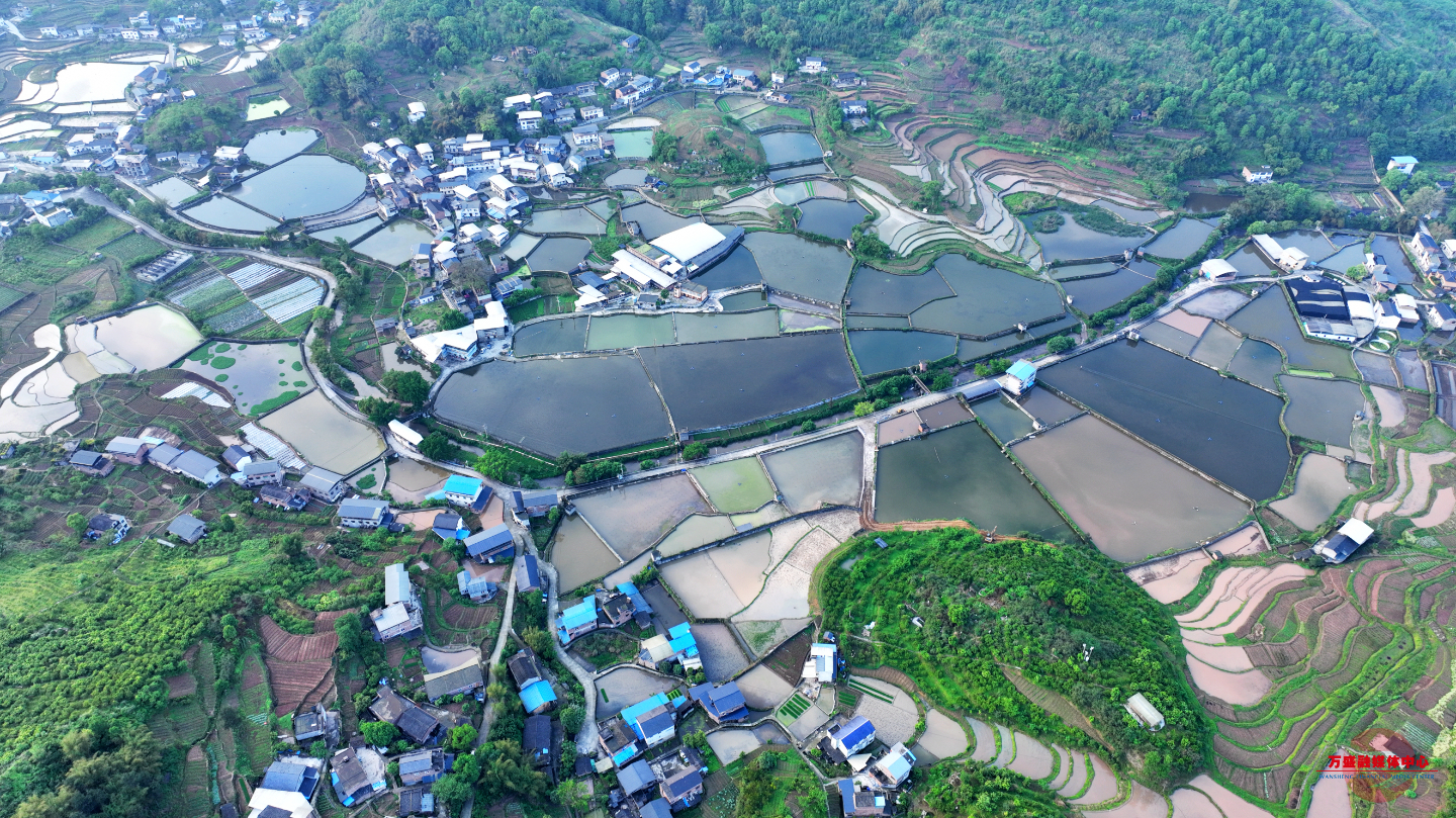 4月21日,南桐镇金兰坝村,成片相连的鱼塘水光潋滟,宛若大地调色盘,与村落、农田、河流交相辉映,构成美丽的田园画卷。