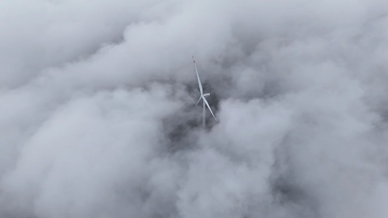 云海中若隐若现的风电机组。陈久玲 摄