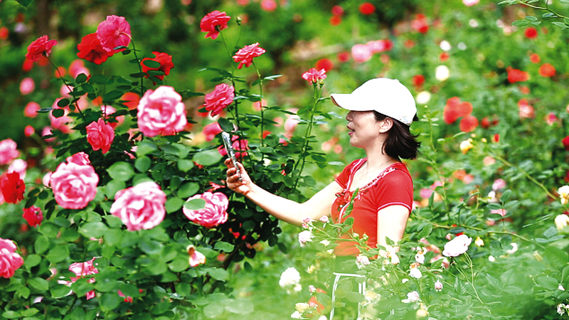 游客拍摄玫瑰花。近段时间,在盛山植物园,上万株玫瑰缤纷绽放,形成一片花的海洋,蔚为壮观,吸引了不少游客前来赏花拍照。