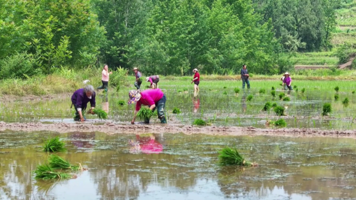 在海拔600余米的善广乡雨台村,成片的水田整齐划一地镶嵌在山野。当地村民正抢抓农时,将一兜兜长势良好的水稻秧苗插进稻田里。因山区田块较小,不方便使用大型机械,为了不让稻田撂荒,村民采用手工插秧,确保粮食稳产增收。