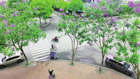 5月13日,大足城区学圣路的蓝花楹悄然绽放,成为一道亮丽风景。