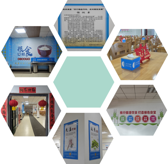 一是在餐厅进口张贴节粮倡议书;在就餐区设置文化宣传墙、在餐桌上摆放节约用餐提示牌;在后厨备菜区、仓库张贴节约提醒,将“厉行节约、反对浪费”理念体现到餐厅每个角落,形成浓厚氛围。