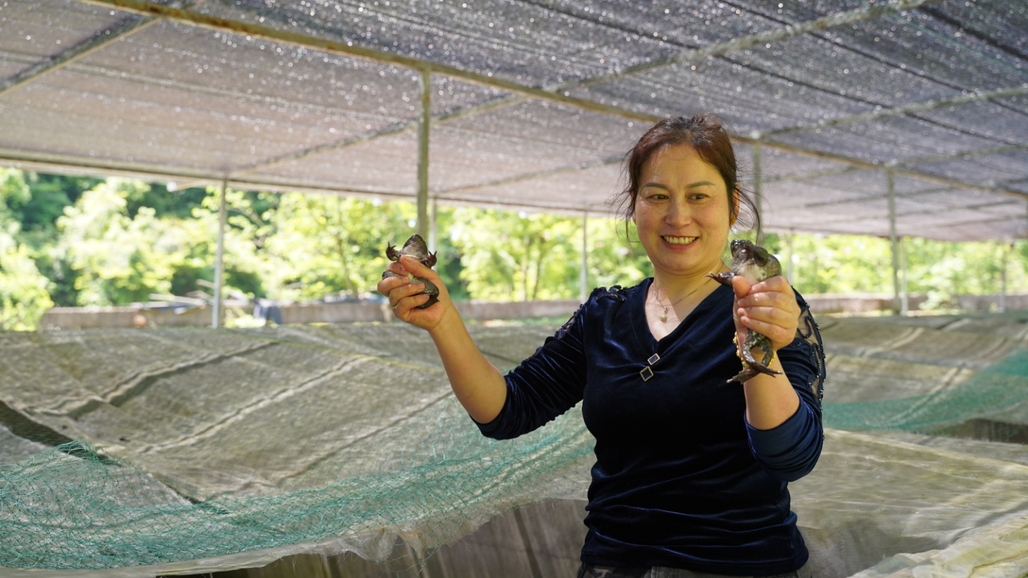 今年47岁的汪昌春,原来一直外打工。2015年,一次偶然机会她了解到人工养殖生态石蛙的巨大市场,便和家里人商量,回到云台村在青山绿水之间建立起养殖场开始尝试着养殖石蛙。