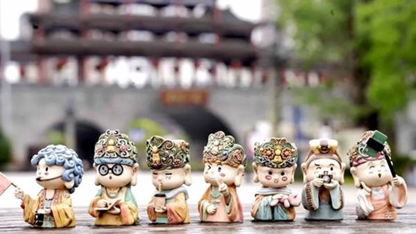 “石刻旅行家”手办盲盒由8款不同的卡通形象组成,包括一个大“卧佛”,7个小“卧佛”,取材于大足石刻写意造像“卧佛”。这些卡通形象将古老的卧佛融入现代社会,显得新鲜有趣。它们或手握相机,或背包行走,或摆出俏皮的剪刀手,甚至聚首品味着现代都市的奶茶……一个个可爱的石刻卡通人物形象,将古老的石刻艺术与现代生活元素巧妙结合,让宝顶山“卧佛”造像焕发出全新的艺术魅力。借助这款手办盲盒,大足石刻将走入千家万户,加快实现“活”起来、“火”起来。