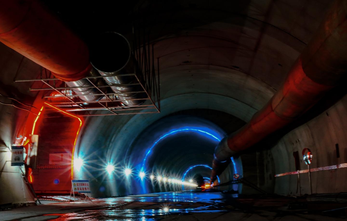 如今,走进隧道左洞,并没有想象中风机那种巨大的轰鸣声,记者看到,变电站、值班室在橘黄色灯带勾勒下静静地矗立在一侧,洞顶上两台45KW射流风机不停地向洞内深处提供着新鲜风流。