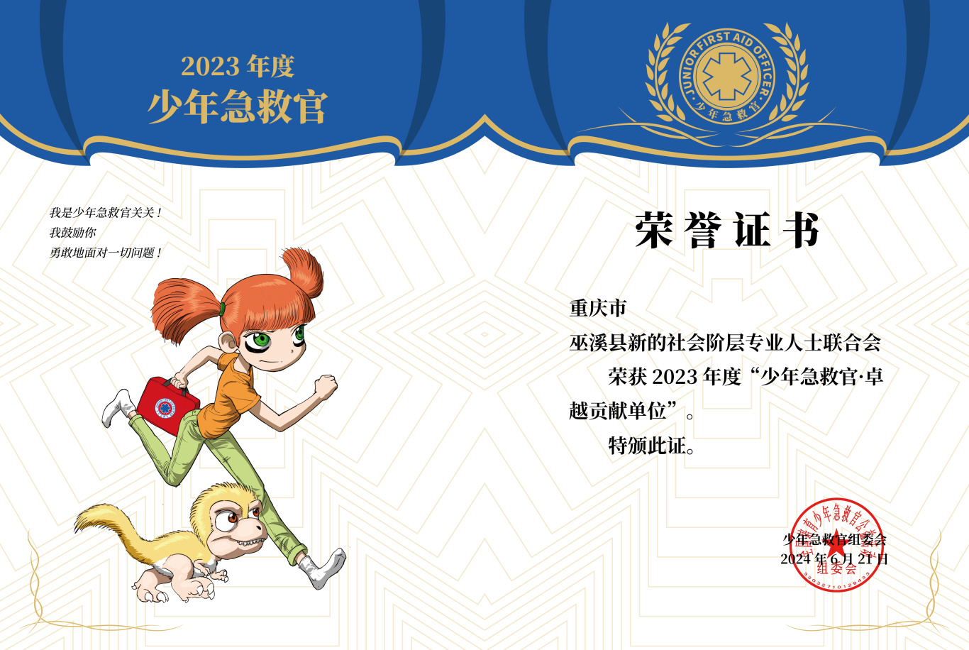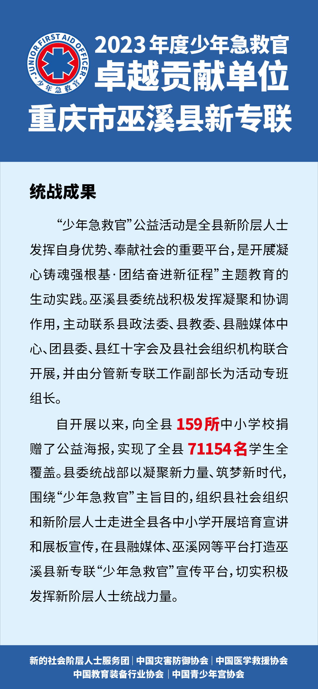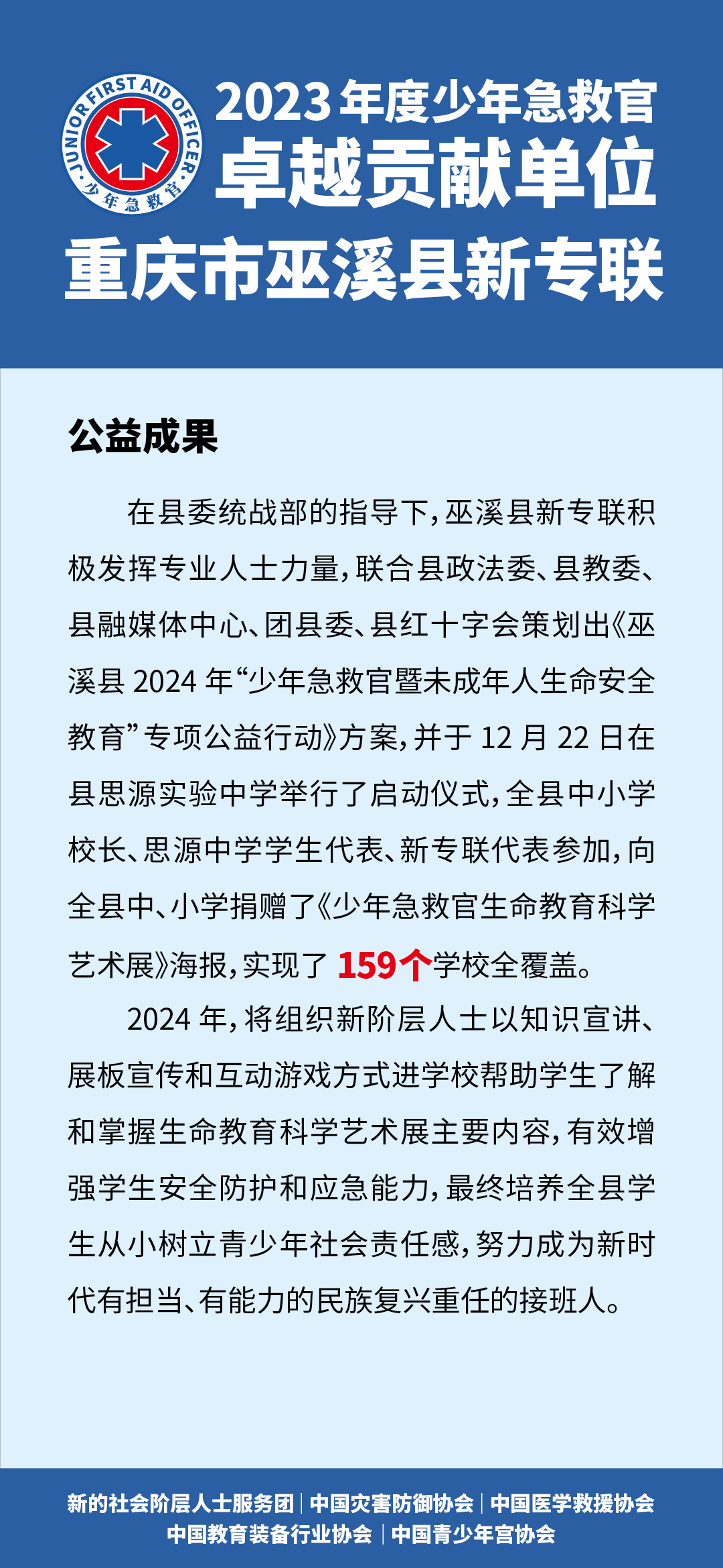 近日,全国“少年急救官”公益项目2023年总结暨2024年启动大会在四川省成都市成功举办。会上,对各级新联会及社会合作伙伴先进代表进行表彰。其中巫溪县新专联荣获2023年度“少年急救官·卓越贡献单位”荣誉称号。(全国仅35家地县获此殊荣)