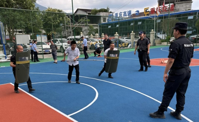演练现场,教官详细讲解防暴钢叉、防暴盾牌、应急棍的使用方法、技巧,同时通过设置不同场景,对应急单位成员进行模拟演练,过程中及时纠正使用装备中的不规范动作,取得良好的培训效果。
