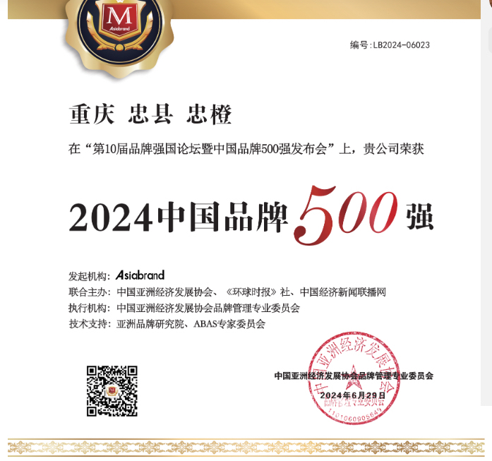 6月29日,第10届品牌强国论坛在北京举行。会上,忠县忠橙凭借卓越品质与品牌影响力,获得“2024中国品牌500强”“2024中国(橙类行业)十大领军品牌”两项荣誉,其品牌价值跃升至105.89亿元,标志着忠县忠橙品牌建设取得历史性突破。