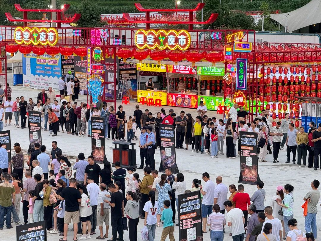 星空夜市:在秀场外建有可接待上万人的特色美食文化街,包含百余种精品小吃、特色夜宵,数十种文创产品的上百个店铺,几十种吸引儿童和年轻人的趣味游乐项目、多点多时段的文艺表演及多个丰富有趣的网红打卡点的大型夜市。
