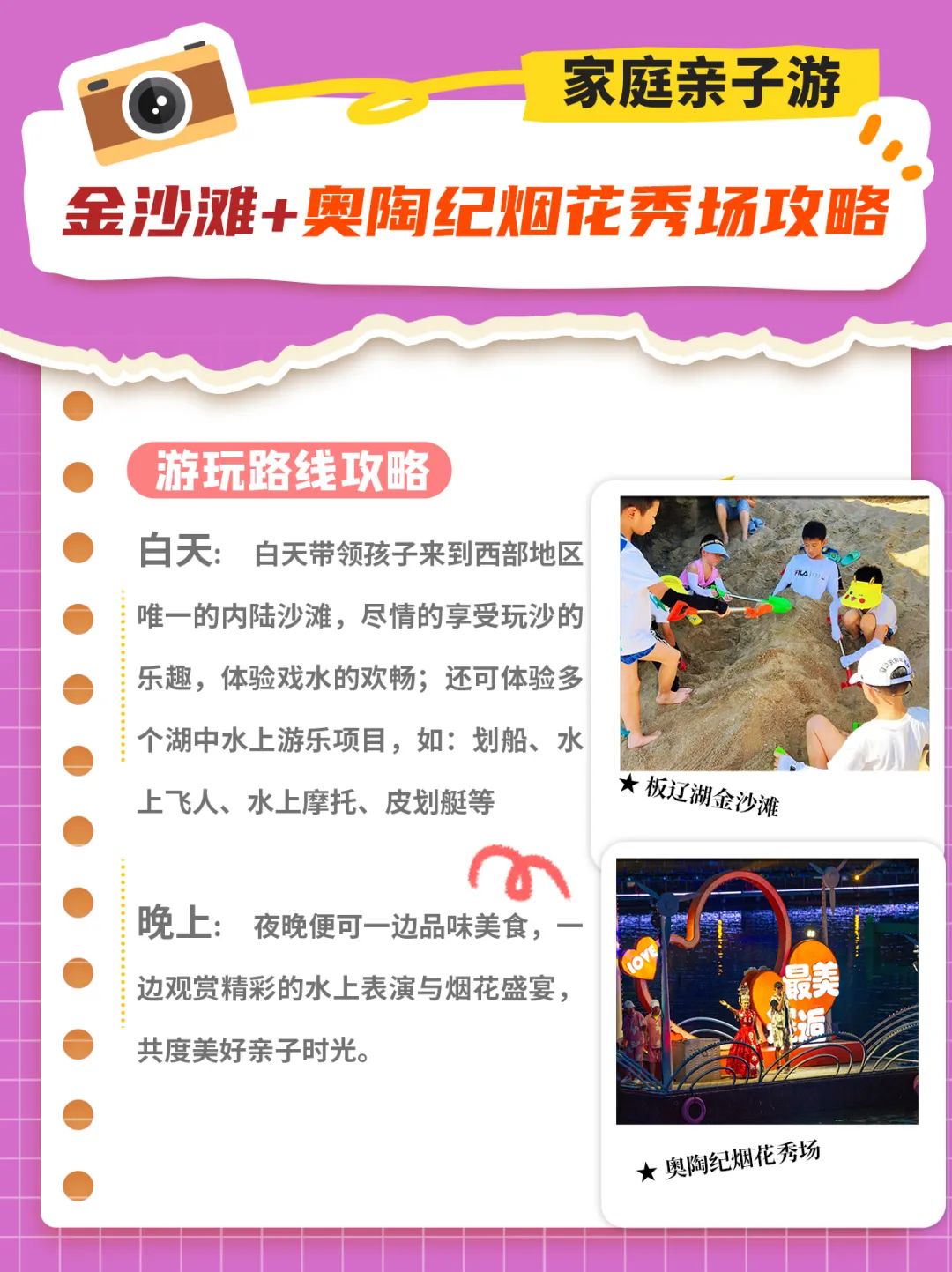 西部地区唯一的内陆沙滩胜地——板辽金沙滩,儿童们能够在这里尽情享受玩沙的乐趣,体验戏水的欢畅;