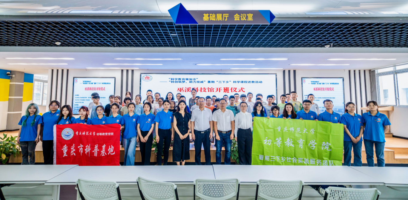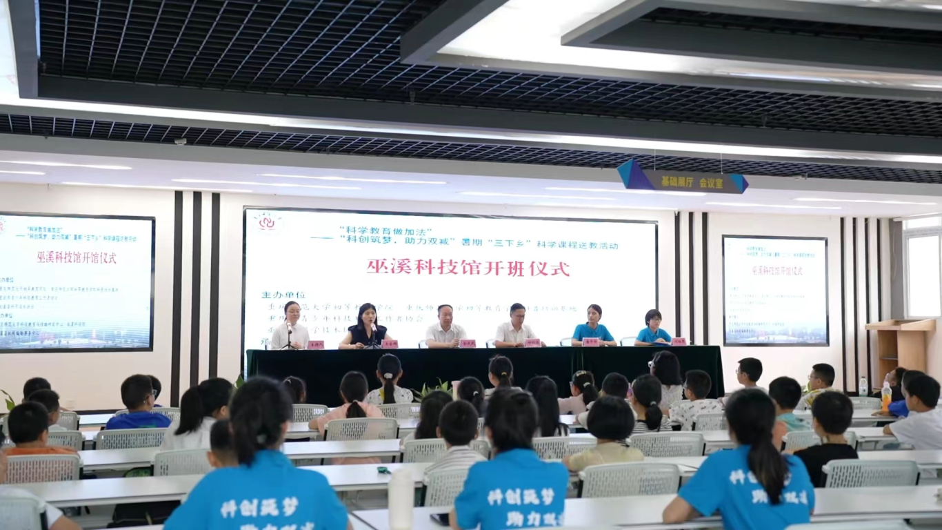 7月11日,由巫溪县科协、重庆市青少年科技教育工作者协会、重庆师范大学等单位联合举办的“科创筑梦·助力双减”暑期“三下乡”科学课程送教活动开班式在县科技馆举行。重庆师范大学初等教育学院实验中心主任钟绍波副教授、重庆师范大学初等教育学院教师唐中华博士参加活动。
