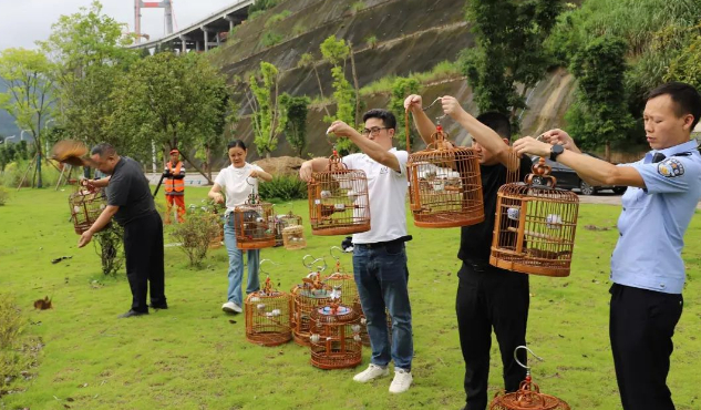 7月12日 在云阳县青龙街道锦绣社区一野外林区 县公安局森林警察大队联合县林业局 将依法查获的国家二级保护动物 30余只画眉鸟放归大自然 在放飞现场 工作人员认真检查每一只鸟儿的状态 然后逐一打开鸟笼,让它们重返自由 出笼后,画眉鸟迅速展翅飞入茂密的树林 消失在自然之中