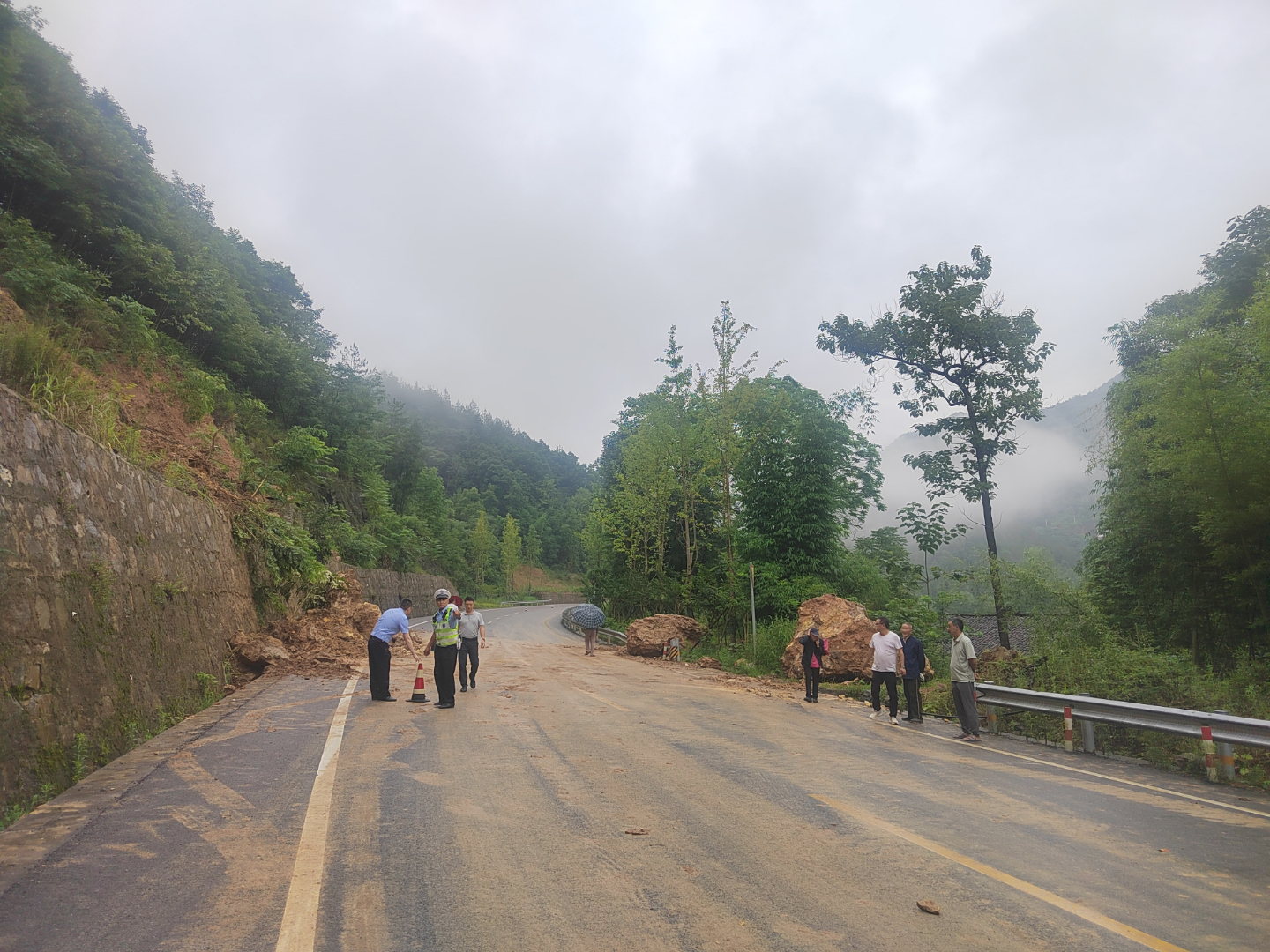 当时,双塘村网格员正在快速路沿线排查灾情,发现落石情况后第一时间电话报告镇政府值班室,值班领导迅速组织塘坊派出所、文峰公巡中队和双塘村网格员及最小应急处置单元前往现场查看落石险情,发现因持续强降雨造成快速路边坡山体松软而引发山体滑坡,严重影响车辆通行。