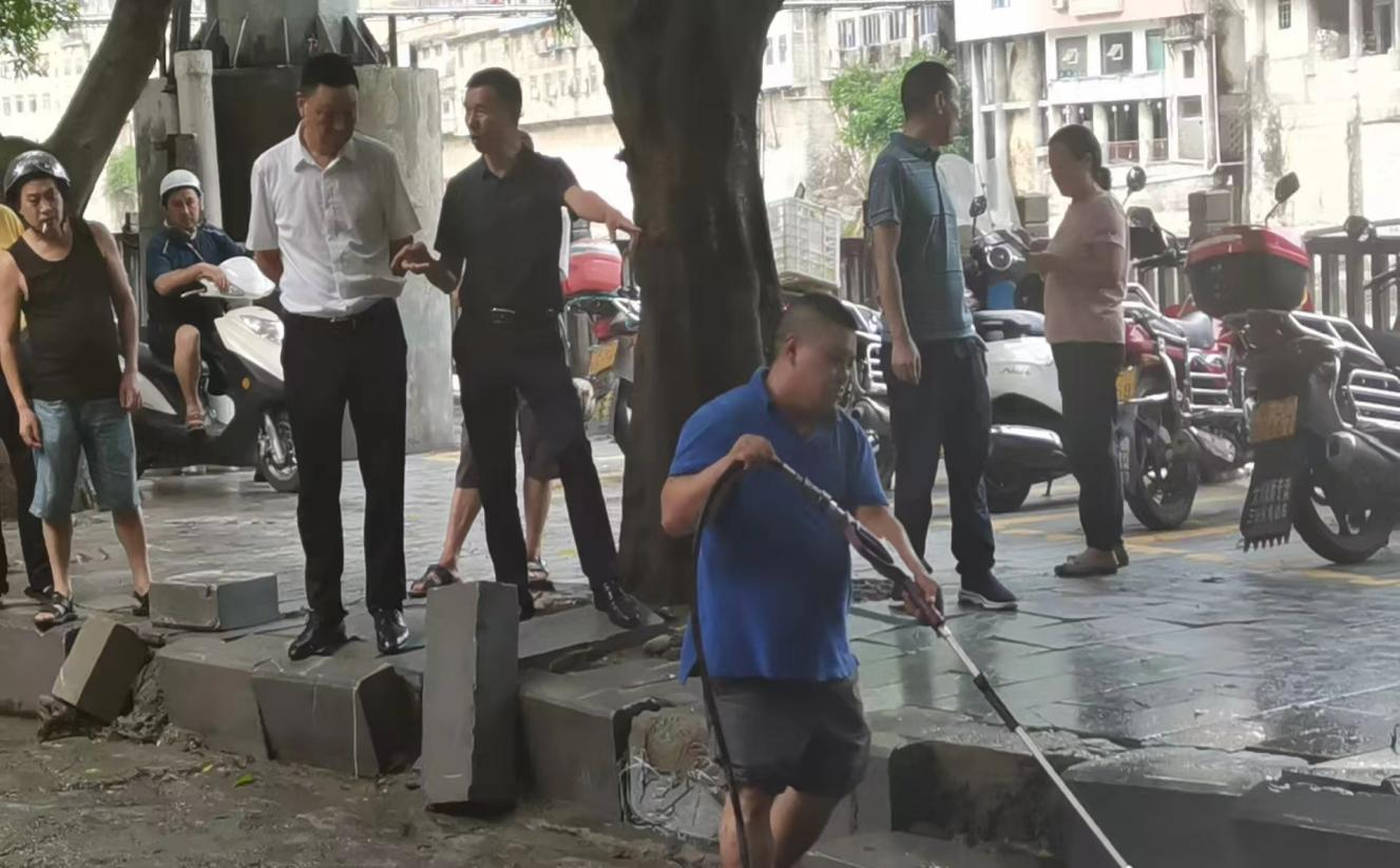 ▲县住房城乡建委疏通受泥沙堵塞的雨篦子。