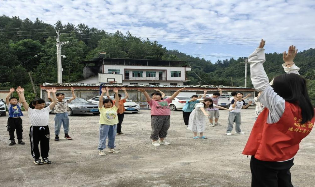 △三坪村志愿者带领学生做早操 卢雨彤摄
