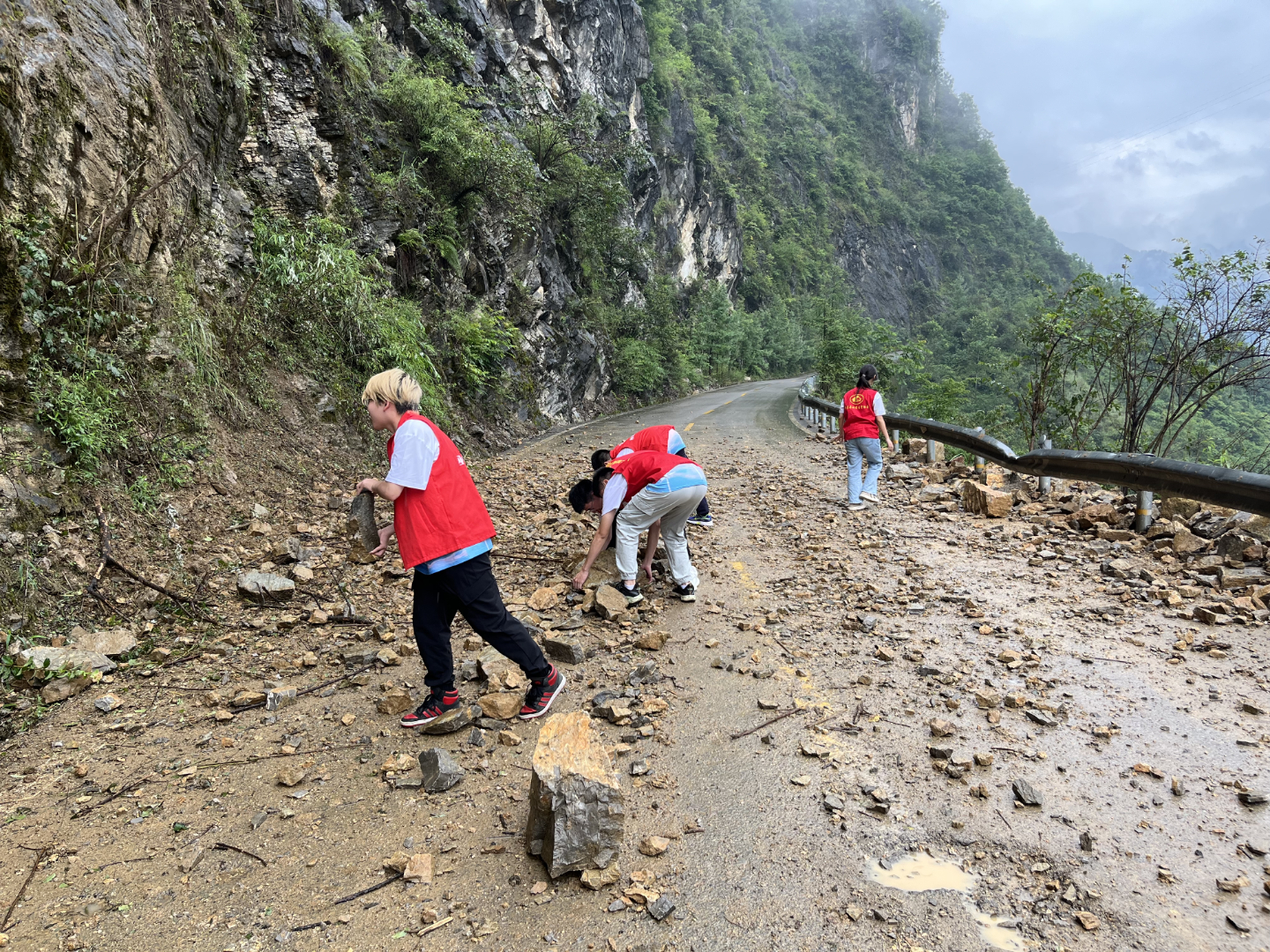 在塌方现场,志愿者们第一时间设置道路安全警示牌,提醒过往车辆行人注意安全。同时,志愿者们不怕累、不怕脏、齐心协力清理塌方道路上的落石以及倒塌树枝、泥土等路面障碍物。经1个小时左右,受阻道路的大部分落石已被清理,车辆得以恢复正常通行。