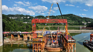 中铁十八局渝万高铁站前2标㽏井河双线特大桥连接忠县高铁站,是渝万高铁站全线的重要控制性工程。桥梁7号主墩位于水中,墩高84.5米,采用双壁钢围堰施工。双壁钢围堰长33.2米、宽19.0米,壁厚2米,深度43.5米。其现场组拼、沉放及封底施工,受三峡库区水位变化等因素影响,施工难度较大。