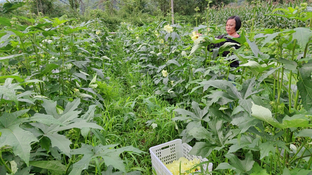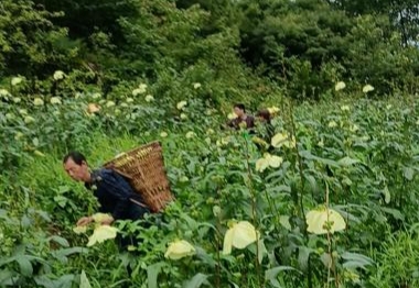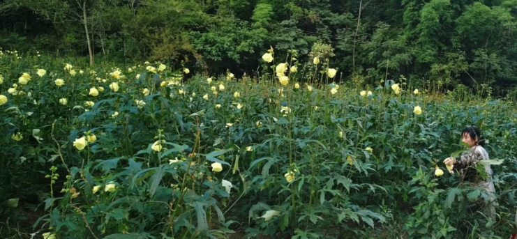 在朝阳镇松花村的广袤土地上,数名村民正穿梭于花海之中,手法娴熟地采摘着金花葵。他们一手轻摘花朵,另一手迅速将其放入背后的背篓,田间洋溢着勤劳与喜悦的氛围。