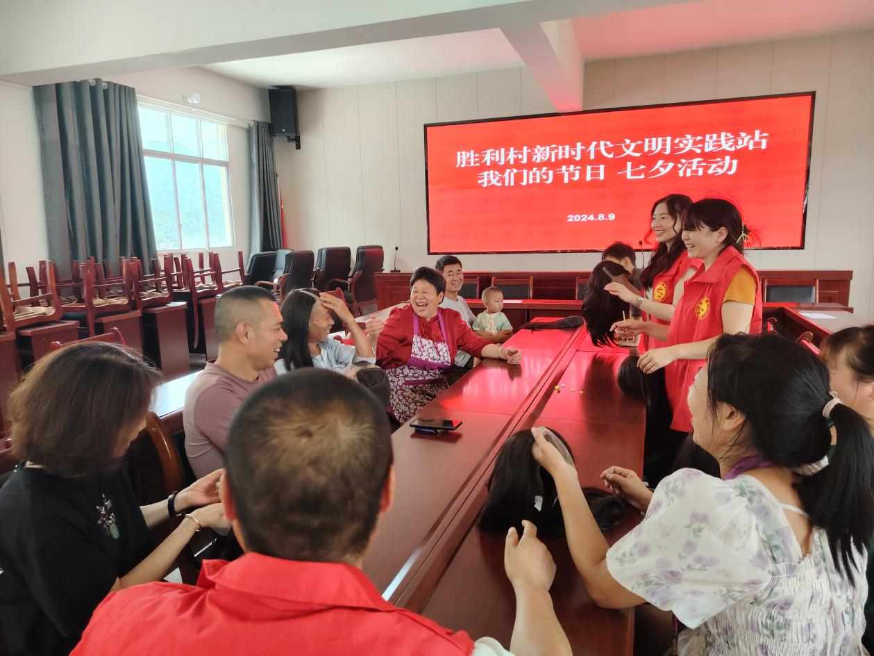 8月9日,胜利乡胜利村新时代文明实践所(站)组织村民开展“我们的节日·七夕”编制假发活动。