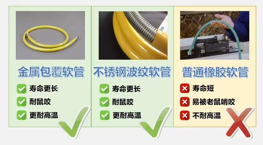 即家用普通橡胶软管使用时间过长易出现硬化、裂纹、被鼠咬等情况,容易导致漏气,必须淘汰。到期及时替换使用寿命更长的不锈钢金属波纹软管(使用寿命8年),可以减少非人为原因造成的户内爆燃事故。