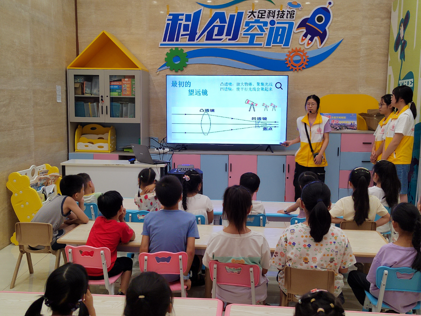 课堂上,志愿者还带领小朋友组装了简易望远镜模型,指导小朋友使用望远镜观察远处的物体,在体验中进一步巩固了课堂知识。