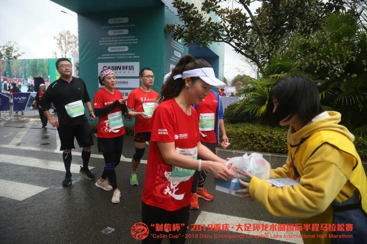 跑友在完赛区领取丰富的大足环龙水湖国际半马完赛物品。
