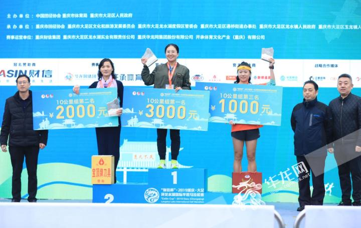 10公里(女子)成绩:贾亚亚以00:39:41的成绩获得女子组第一名。 叶瑞、姚兴敏分以40分01秒、40分58秒获得二、三名。图为10公里女子组颁奖现场。(华龙网-新重庆客户端记者 谢鹏 )