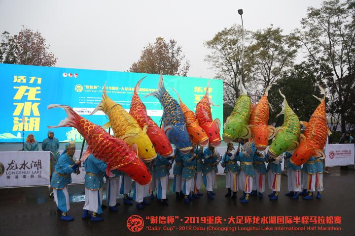 虽然天气有点冷,但选手热情不减!在大足环龙水湖国际半马的最美赛道上,大足鲤鱼灯,为选手“助威”。