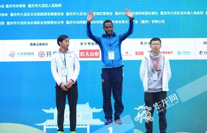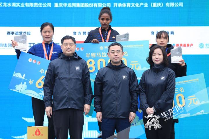 半程组(女子)冠军来自埃塞俄比亚的MOHAMMED MISA YIMER,中国选手冯青、刘君慧分获二、三名。大足区常委、区委办公室主任张明,大足区政协副主席李志,华龙网集团党委书记、董事长李春燕为获奖选手颁奖。(华龙网-新重庆客户端记者 谢鹏 )