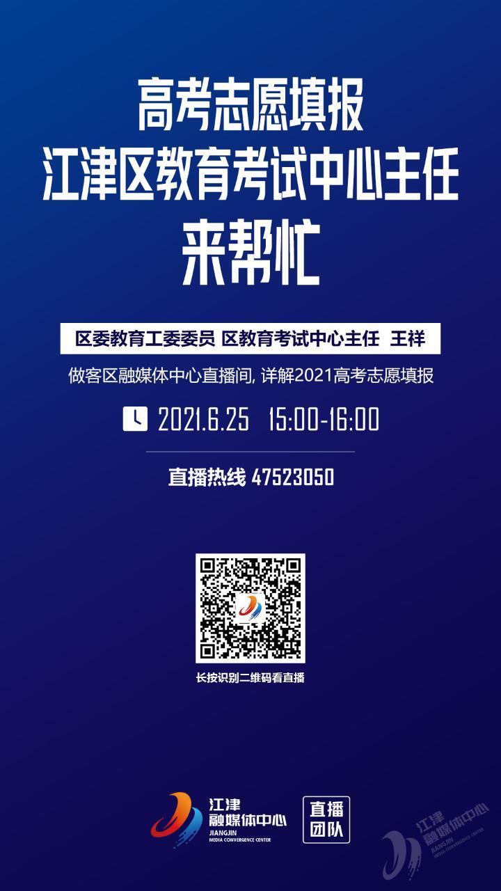 2021年6月25日15:00,区委教育工委委员、区教育考试中心主任王祥做客区融媒体中心直播间,详解2021高考志愿填报,江津融媒体中心通过各网络平台进行直播,网友可关注江津发布、江津融媒微信公众号、最江津APP,江津融媒视频号,抖音“江津观察”等平台观看。