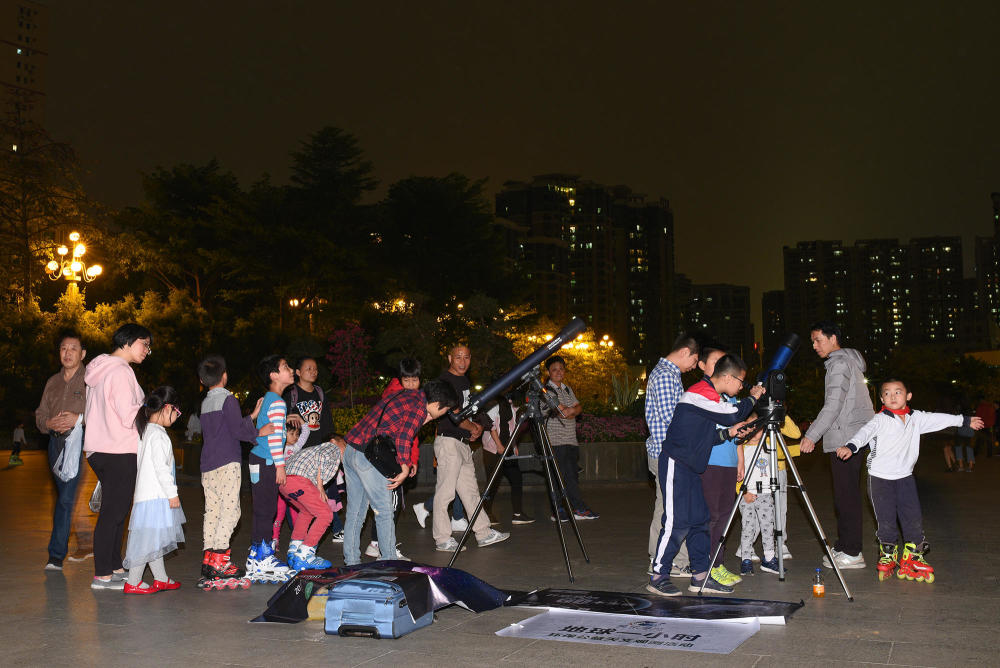 广东省星空漫游天文科学俱乐部在广州市中山三路英雄广场举办路边天文夜活动,吸引众多市民参加。