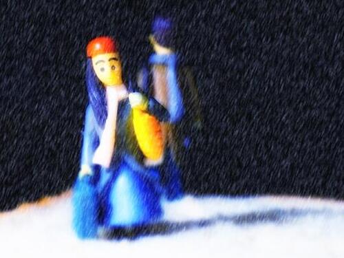 某宝上买回几个小人偶道具,再利用手边的物件营造场景:娃娃练习拼音的磁贴写字片,可以拿来做公路,连“车道线”都是现成的;白布、白毛巾揉作一堆,镜头一虚化,那就是雪山;钢琴漆面的笔记本电脑,放上一牙橘子皮,就能镜湖泛舟,台灯的倒影正好充当月亮;一盏小桔灯,在焦外虚化为一个温暖的光斑,充当朝阳、夕阳,那就全凭我作上帝主张了……