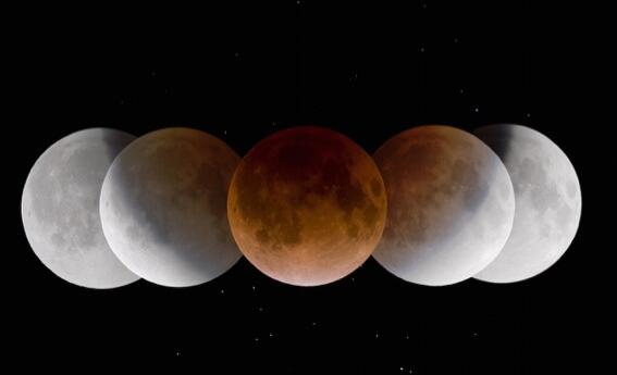 下面还有一些创意的拍摄方法,比如记录月全食从初亏到复原的整个过程,那就需要长时间曝光拍摄了。下面这张照片就是累计3小时曝光合成的,你可以看到月亮由亮变暗,由白变红的整个过程。